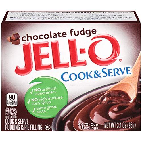Jell-O Chocolate Fudge flavored pudding & pie filling mix makes an amazing standalone dessert and a decadent addition to your favorite recipes. Easy to prepare, the mix makes a smooth, rich pudding in minutes; simply bring some milk to a boil in a saucepan and stir it in. The Cook & Serve pudding can be used in tons of exciting ways in the kitchen. Add it to your batter for a moister cake, spread it between layers as a less-sweet alternative to frosting, or use it as a filling for pies. You can also experiment with adding toppings like fruits, nuts and chocolate chips to give each serving a unique twist. Creamy Texture, Deliciously Decadent Chocolate Flavor! A quick and easy way to satisfy your dessert cravings, Jell-O Chocolate Fudge flavored pudding offers a delightfully rich taste, yet it is fat-free and contains no artificial sweeteners or high fructose corn syrup. An effortless standalone dessert and a versatile topping or base for other recipes, the pudding mixes easily and sets quickly every time. The 3.4-ounce box makes four servings, so you can enjoy sharing this classic treat with friends and family after dinner or as a snack between meals. Each serving contains just 90 calories!