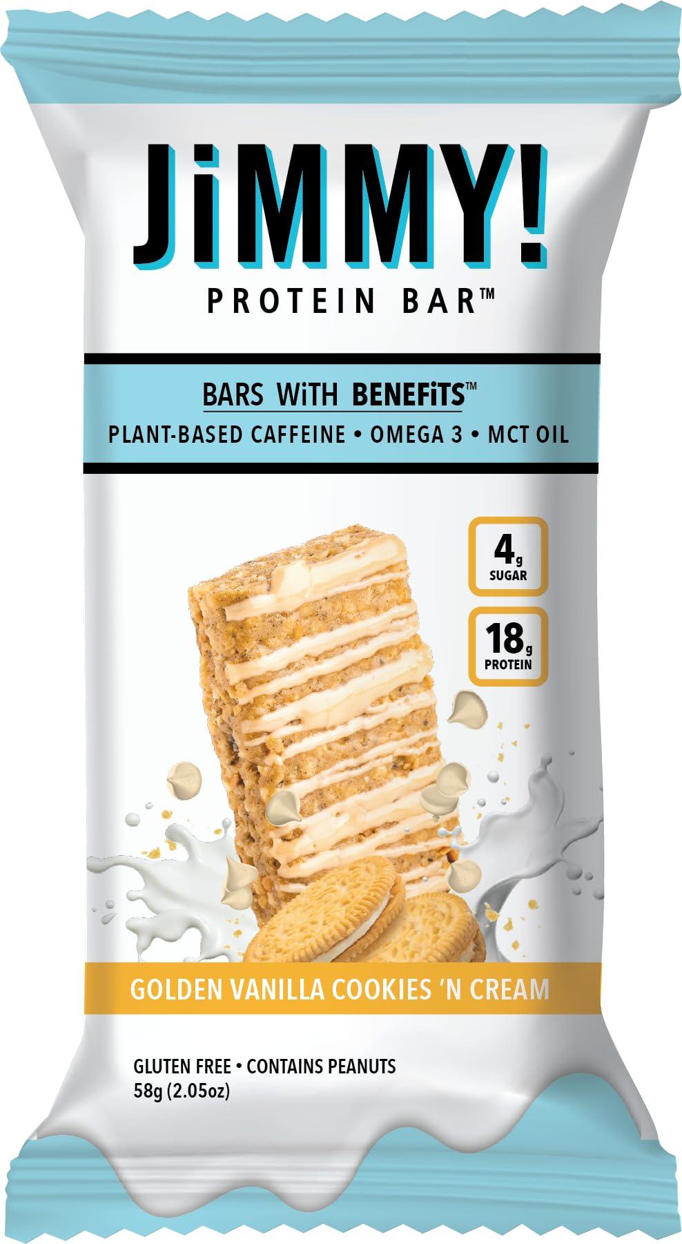 JiMMY! Protein Bars offer a powerful blend of 18g protein and only 4g sugar, perfect for fueling your fitness without compromising taste. Infused with natural caffeine and Omega 3, these bars provide sustained energy and brain support. Indulge in the delicious vanilla, cookies, and cream flavor of this gluten-free, no artificial sweeteners snack. Ideal for on-the-go, these bars fit any lifestyle, including keto, ensuring you stay energized and aligned with your wellness goals.