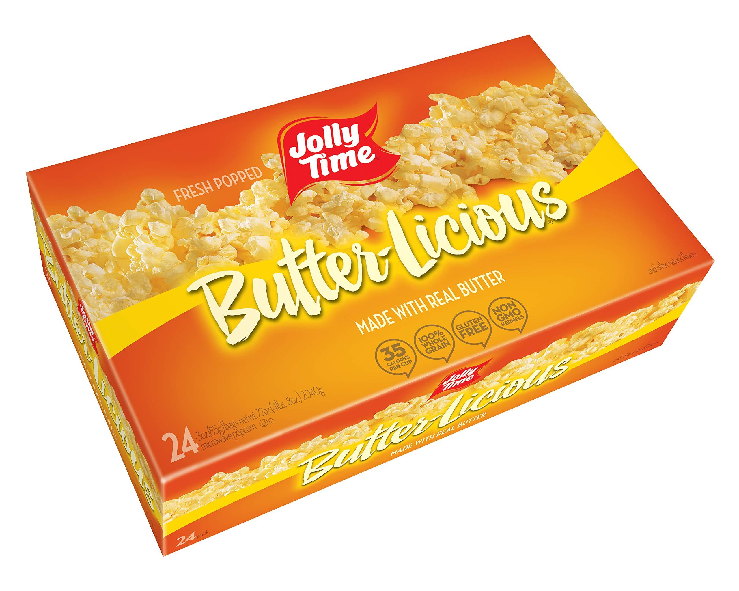 If youre looking for classic butter flavor, look no further! JOLLY TIME Butter-licious is the perfect blend of light butter and salt goodness. There's no need to add any salt seasoning, oil topping or powder and the best part is that it's so easy to make at home! This jumbo pack size of 24 microwaveable bags is perfect for family gatherings, sporting events and parties - you can even use the single serve bags for fundraising! Perfectly crisp, 100 percent whole grain popcorn kernels packed with a mouth-watering, melted buttery taste with zero grams of trans fat and zero hydrogenated oil. This gluten-free, non-gmo popcorn is a high fiber, 0 cholesterol snack that tastes great and is a healthier alternative to other full-flavored buttered popcorn products.