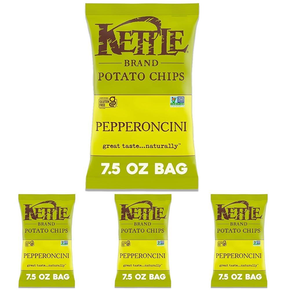 Kettle Brand Pepperoncini kettle chips start with a search for undisputed potato excellence. Determined not to disrupt the flawless, spudsy goodness, these beauties are kettle cooked, skin on, one batch at a time. Carefully crafted to strike the right balance of peppery taste, tangy vinegar, and the perfect amount of heat, these flavorful chips give you a delicious taste of the Mediterranean. The perfect companion to a classic hero sub, or any sandwich! When you open a bag of our Kettle Brand potato chips, you know you're getting incredible kettle chips made with authentic recipes by real people. From their farms to our kitchens and then to your home, the time and attention every Kettle Brand worker puts into their products is care you can trust. All that, plus Kettle Brand chips deliver a delicious snack thats non-GMO Project Verified, and Certified Gluten-Free. This large 7.5-ounce bag of chips is perfect for sharing at parties, picnics, or just snacking on the couch. Kettle Brand potato chips. Extra in a good way.