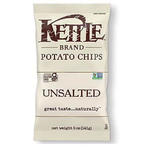 Kettle Brand Unsalted kettle chips start with a search for undisputed potato excellence. Determined not to disrupt the flawless, spudsy goodness, these beauties are kettle cooked, skins on, one batch at a time. Made with two ingredients: potatoes and oil, we skipped the salt but never skimp on flavor or that satisfying crunch. Just whole potatoes, perfectly sliced, cooked to perfection. Why mess with perfection? When you open a bag of our Kettle Brand potato chips, you know you're getting incredible kettle chips made with authentic recipes by real people. All that, plus Kettle Brand chips deliver a delicious snack that's non-GMO and Gluten-Free. You can share this 5-ounce bag of chips with a friend, but we won't blame you if you keep them all for yourself. Kettle Brand potato chips. Extra in a good way.