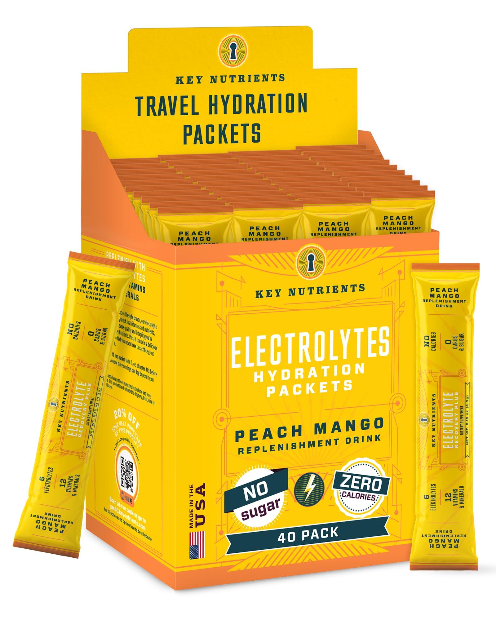 - Loaded with Key Nutrients - Refuel with our tropical peach mango electrolyte powder, powered by 6 key electrolytes, including magnesium, potassium sorbate, and calcium. Our electrolytes powder packets also contain 12 vitamins to help you stay healthy and hydrated.