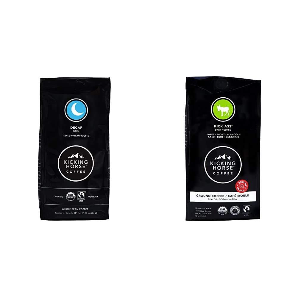 - Includes 1 bag of Kicking Horse Decaf Dark Roast Swiss Water Process Whole Bean (10 Oz) and 1 bag of Kicking Horse Kick Ass Dark Roast Ground Coffee (10 Oz).