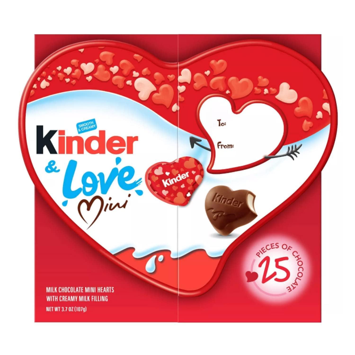 - KINDER & LOVE GIFT BOX: Share the love this season with the Kinder & Love Gift Box, a Valentine's Day treat featuring an iconic heart-shaped box filled with 25 individually wrapped mini chocolate hearts and a to/from label for easy gifting