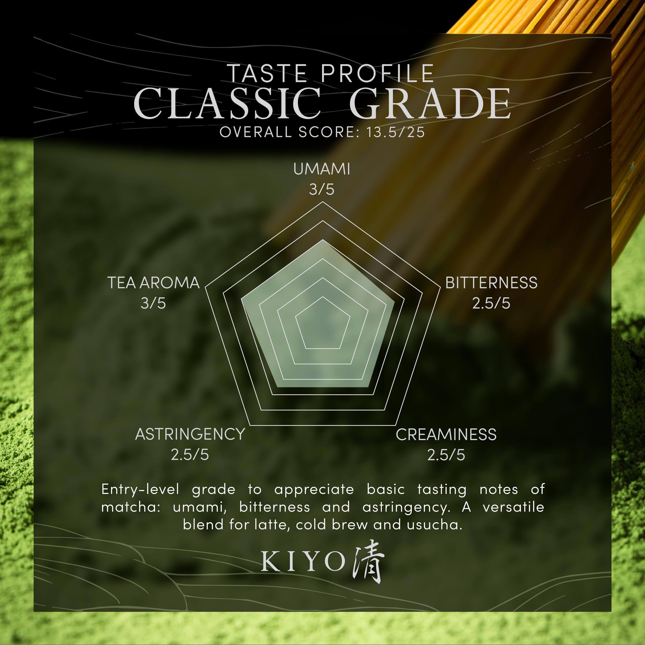 - Perfect for Beginners - Balanced, Smooth and Versatile. Kiyo Matcha Classic Grade is an entry-level grade for beginners to appreciate basic tasting notes of matcha: umami, bitterness and astringency. This is a versatile blend for latte, cold brew and usucha.