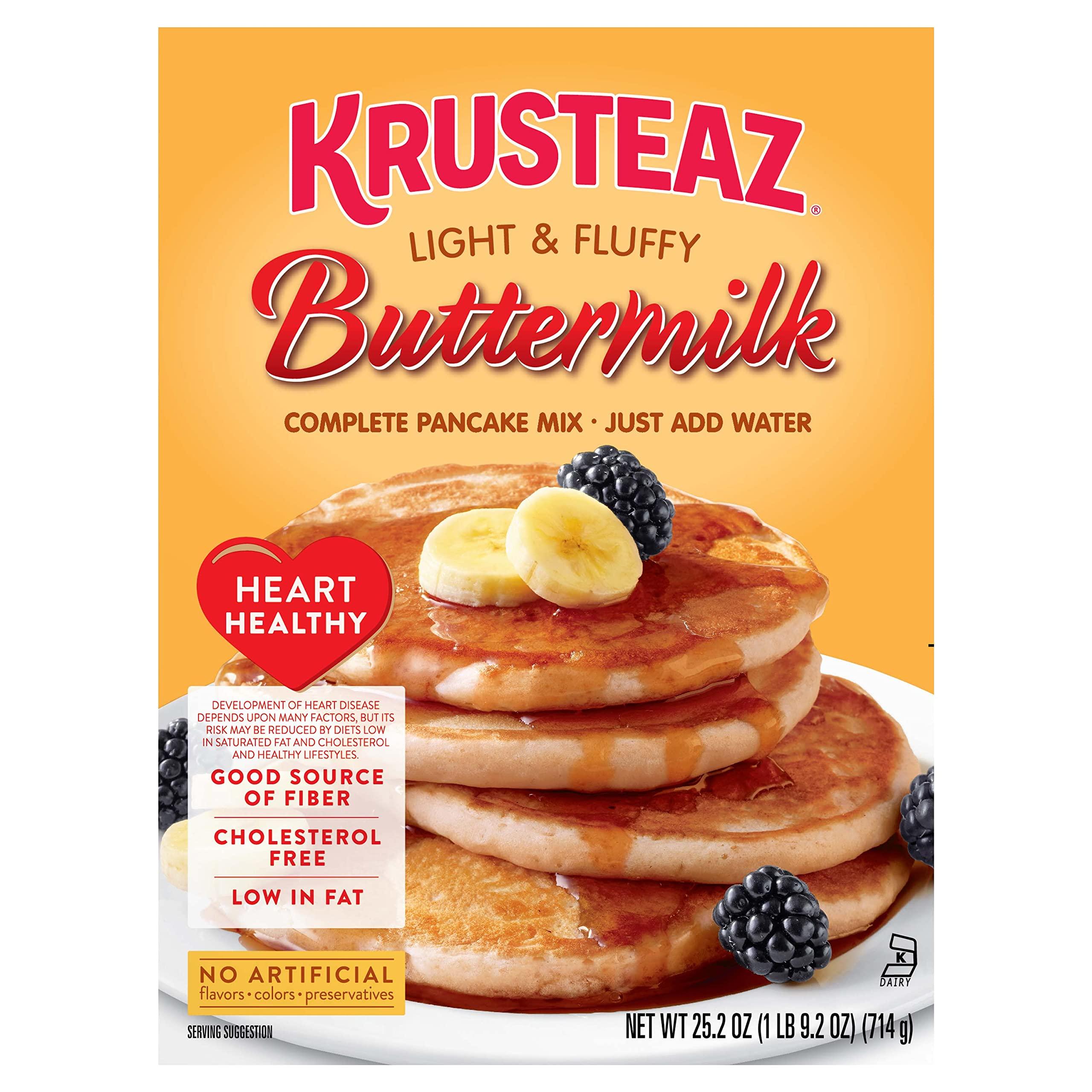 Krusteaz Heart healthy buttermilk light & Fluffy pancake mix is a fantastic blend of wholesome wheat and whole wheat flours, creating this premium mix that will make your heart - and your taste buds - sing! After all, heart-healthy doesn't have to mean less flavor; these pancakes are nutritious, delicious, and a snap to make. To prepare, heat your lightly-greased pancake griddle to 375 DegreeF, lightly spoon out the measured mix, and whisk it with water. (Do not over-mix.) then, let the batter stand for two minutes, pour slightly less than 1/4 cup of batter per pancake onto the griddle, and cook! Made for health-conscious, pancake perfection, these moist pancakes can be a sure-fire staple for a fulfilling breakfast, another satisfying meal, or even as a late-night pancake treat (and with the light and fluffy, familiar Krusteaz texture you've come to love). this order includes a 25.2-Ounce box. They say home is where the heart is. For us, that's the Pacific Northwest - a place known for its natural beauty and balanced way of life, and where we chose to start our family business. It's also the inspiration behind the food we make. Made with real ingredients, 100% whole grain flour, and hearty protein, Our pancakes, muffins and microwave mixes make it easier to feed your family well, wherever your home is.