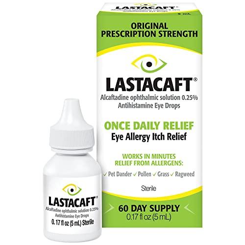 When you have itchy eyes from allergies, look to LASTACAFT Once Daily Relief Antihistamine Eye Drops. Prescription-strength LASTACAFT is clinically proven to relieve eye itching due to allergies in as little as 3 minutes and lasts up to 24 hours.* So how does LASTACAFT work? When allergens in the air come into contact with your eyes, histamine is released which is the bodys natural defense mechanism that causes an allergic response which can make your eyes itch. Once daily LASTACAFT works in minutes to relieve itchy allergy eyes by 1) blocking histamine H1 receptors and 2) preventing further release of more histamine in the eye. LASTACAFT provides eye itch relief from both seasonal and year-round allergens: pollen, grass, ragweed, animal hair and pet dander. LASTACAFT is for use in adults and children ages 2 and older. Its also a great valueeach bottle of LASTACAFT contains a 60-day supply and is FSA / HSA eligible. So, no matter the season, ITS LASTACAFT SEASON. *Based on 16-24 hour studies.