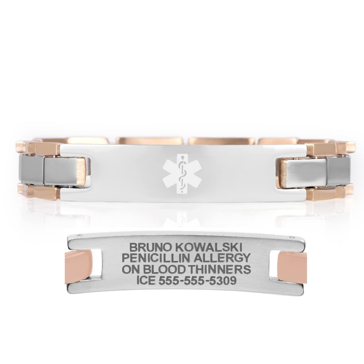 - LUXURIOUS CRAFTSMANSHIP: This stainless steel bracelet blends silver, black and rose tone links with an affixed medical ID tag with a stainless steel ID tag that features a white medical symbol at the center.