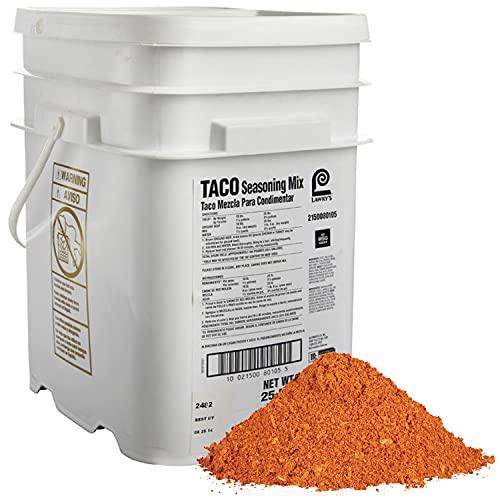 Give your customers the medium heat they crave with Lawry's Taco Seasoning Mix. With this pre-mixed seasoning, delivering consistent, bold flavor is possible every time. While it's traditionally used for tacos, this versatile blend can also liven up other chicken, pork and vegetable recipes, giving you endless options for creating stellar menus. This taco seasoning contains only carefully selected, top-quality ingredients. A combination of herbs and spices achieves this iconic flavor with some chile pepper and paprika for additional heat. This blend's full-bodied warmth comes from spices like cumin, oregano, onion and garlic. Each seasoning mix has been blended and packaged to meet culinary professionals' flavor and performance needs. Lawry's Taco Seasoning Mix comes in a 25-pound pail to fulfill your supply needs. The open lid make measuring and scooping simple, and you can use the handle for carrying. You'll be serving dishes full of on-trend flavor and visual appeal in minutes. This easy-to-use blend also works well in burger and meatloaf recipes. Want to add restaurant-proven boldness to your condiments? Mix it into dips or sauces and create your own unique recipe. The combination of spices and herbs pairs well with everything from casseroles to vegetables. For the perfect tacos, use slightly less than 1 ounce of the mix per pound of ground beef, chicken, another meat or a meat substitute of your choice. Once your meat is almost cooked, drain off the fat and add in the seasoning with 2/3 cups of water. Bring everything to a boil and reduce the heat to low, stirring occasionally. Let simmer for five minutes, then spoon the mixture into your favorite taco or fajita shells. While this bulk taco seasoning brings some flavor and fire to your kitchen, it also makes it easy for you to craft dishes your customers can feel good about indulging in. The blend is kosher and made without artificial flavors, colors or added MSG.