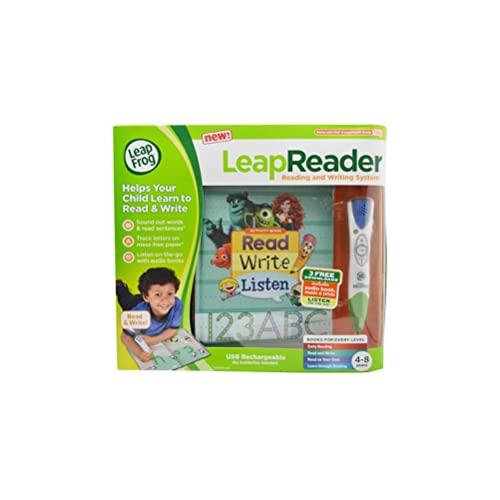 The complete learn-to-read-and-write solutionsounds out words, guides letter strokes and helps build comprehension!* Details Teaches Learn to read Touch pages or words to hear them read aloud, sound out words, and play games that build vocabulary and comprehension at every reading stage.* Learn to write Get stroke-by-stroke guidancetrace letters, numbers, words and more on special paper for mess-free writing.*** Listen on the go Foster listening and comprehension skills with downloadable audio books, music albums and more!**** Build comprehension Lively character voices, fun sound effects and activities help strengthen comprehension and school readiness skills. Interactive books Explore 150+ interactive books and writing activities, audio books, music and more every reading level.**** Rechargeable battery Enjoy uninterrupted play! LeapReader is USB rechargeableno batteries required. Dimensions Product dimensions: 1Wx6.8Hx0.8D Product weight: 1.45 lbs Learn to read with interactive books, practice writing in mess-free workbooks, or build listening skills with audio books and music. ReadingSystemsAt a glance LeapReader Reading and Writing System LeapReader JuniorTag Junior Core Curriculum Reading & Writing Skills Preschool Skills Age Range 4-8 years 1-3 years Includes USB rechargeable battery Learning Features Builds reading comprehension Offers interactive writing guidance Sounds out words & reads sentences Plays learning songs with the built-in audio player Learning Library Library snapshot 150+ titlesBooksMapsFlash CardsBook SetsWriting activity books and special LeapFrog Learning paper Audio BooksMusic AlbumsTrivia Challenges 20 titlesBoard BooksFlash CardsBook Sets Number of content titles included on device 4 1 On-board memory 256MB 8MB Maximum storage capacity of content titles on device Up to 40 5 Compatibility Works with Tag library Works with most Tag books Works with LeapReader Read & Write Series of writing books Compatible with LeapReader library of audio books, music and trivia challenges Works with LeapReader Junior and Tag Junior board books Other Specs AC Adapter Available for purchase Headphone Jack Online Parent Portal USB Port