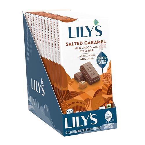 - Contains twelve (12) 2.8-ounce LILY'S Salted Caramel Milk Chocolate Style No Sugar Added Sweets Bars in a bulk box
