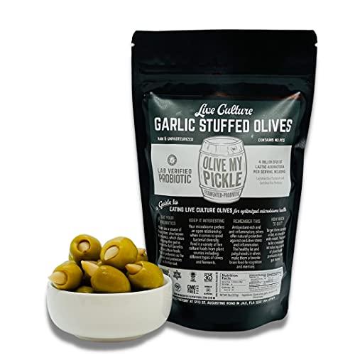 Garlic Stuffed Olives are A favorite of both martini lovers and healthy-olive-eaters, it\'s hard to go wrong with Garlic Stuffed olives. Stuffed with fermented garlic gloves with a firm, large, green queen olive, Garlic Stuffed Olives contain these simple ingredients: queen olives, fermented garlic, filtered water, sea salt and citric acid. These DO NOT contain pits. Enjoy fermented foods 3 times per day, as snacks or with meals as part of your daily healthy eating protocol. Eat olives as a fat-friendly snack, garnish your plate, dress up a charcuterie board or mix into salads. Your 3 pack includes a BONUS Trial Size of our LiveBrine Probiotic Pickle Juice, your free gift. LiveBrine contains over 14 billion CFUs (colony forming units) of lactobacillus per serving. High in electrolytes, LiveBrine is a replenishing, probiotic elixir.
