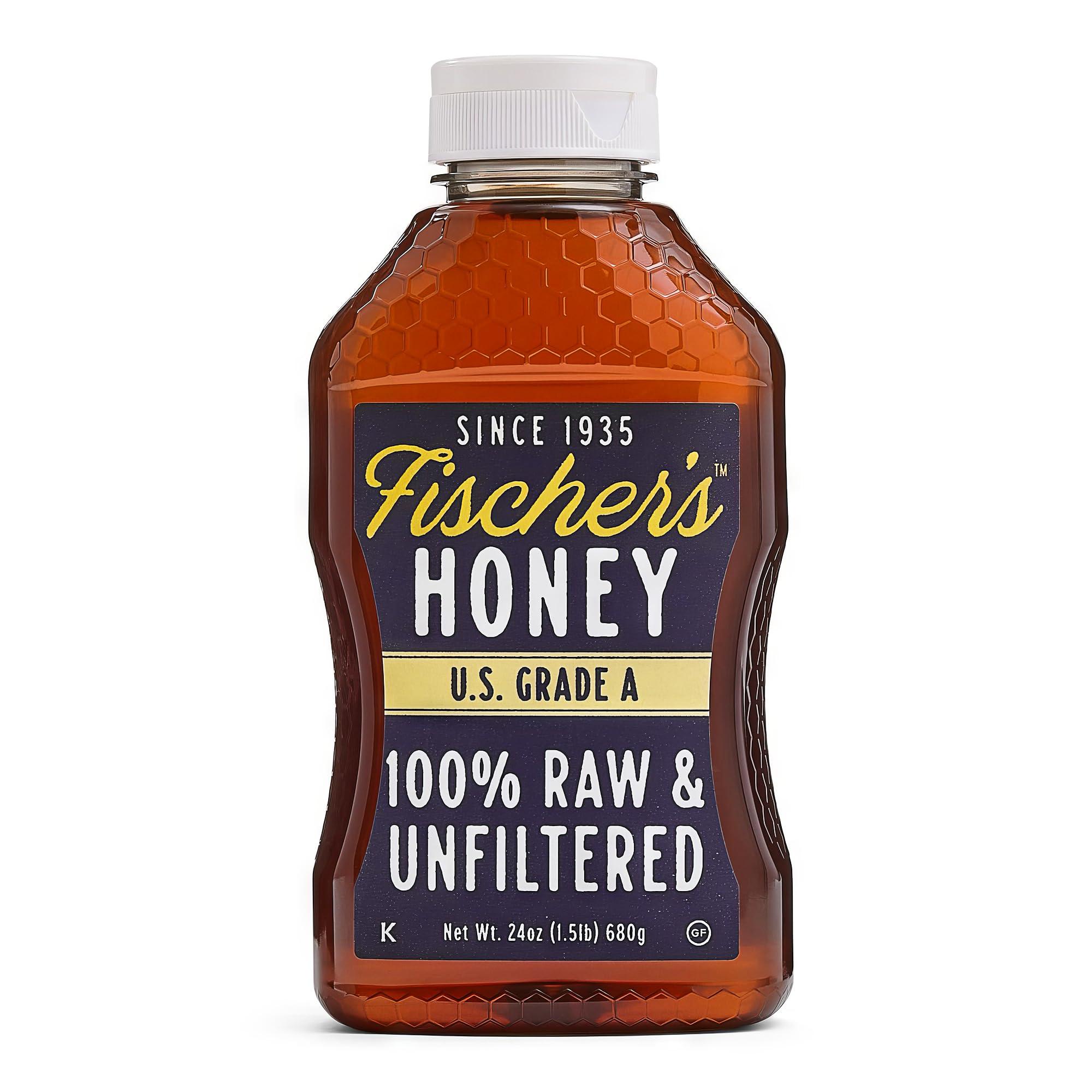 Fischers Raw Honey is 100% pure, unprocessed, honey made in the USA, and packaged in a convenient 24 oz squeeze bottle for easy use. Responsibly sourced from beekeepers all over the U.S. dedicated to bee welfare, our honey is 100% raw, unfiltered, and unpasteurizedno additives, syrups, or flavors. Our all-natural honey serves as a sweetener and sugar substitute, perfect for drizzling on fruits, yogurt, toast, or pancakes. Its rich flavor and sweetness elevate your tea, coffee, and desserts, and give a distinctive twist to your dishes. With naturally preserved vitamins, minerals, and antioxidants, our unfiltered raw honey offers full nutritional benefits. Over time, it may crystallize, showcasing its pure origin. Experience the unadulterated sweetness of raw unpasteurized honey, straight from the hive to your table. Available on Amazon and grocery stores across the country, our honey is the essence of quality and authenticity. Treat yourself to the pure indulgence of raw, unfiltered honeynature's golden elixir.