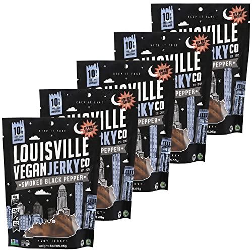 - FAKE MEAT, REAL MEATY FLAVOR: Louisville Vegan Jerkys Smoked Black Pepper vegan jerky is salty, mild, & robust with just a hint of sweetness. Our vegan jerky is subtly spiced with organic black pepper, nutmeg, garlic, & onion.