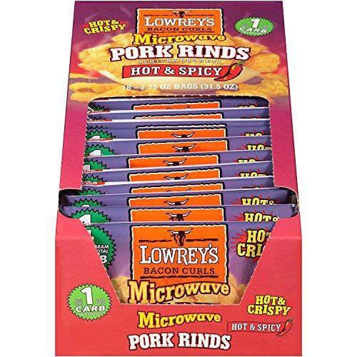 The Lowrey's Hot & Spicy Bacon Curls make the perfect low-carb snack. Not only are the bacon curls delicious, but they have 6g of protein per serving and less than half the fat of fried pork rinds. To make, simply put Lowreys Bacon Curls in the microwave for 1 to 2 minutes and watch them puff up. Enjoy the hot & crispy pork rinds right from the bag or with your favorite hot sauce, salsa or barbecue sauce.