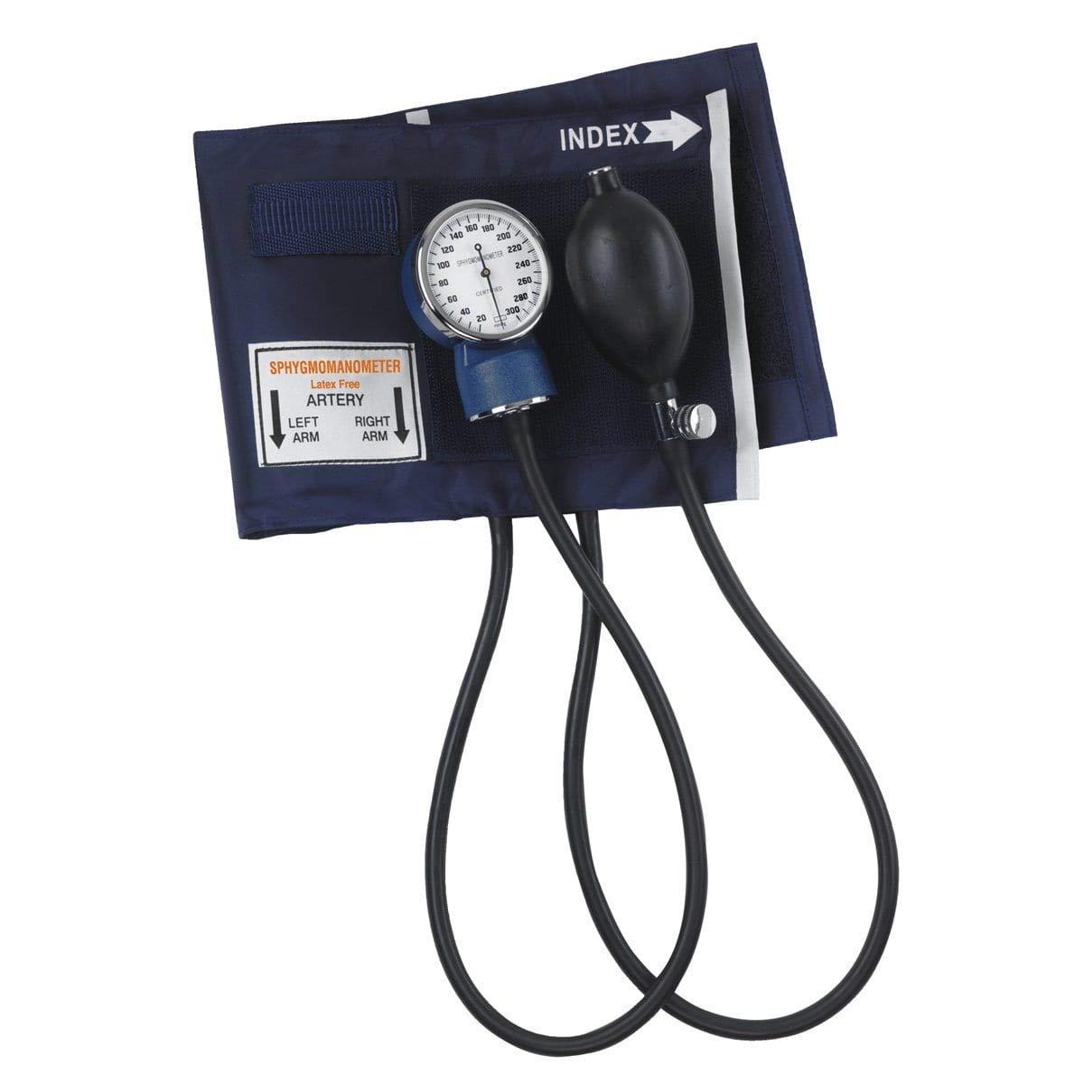 MABIS economy thigh aneroid sphygmomanometer. Includes: standard air release valve, inflation bulb, blue nylon calibrated cuff (16.1 in. - 24.2 in.) and zippered carrying case. 5-year replacement warranty on gauge. - Blue. Adult size - 11 to 16/4 Inch circumference. 5-Year Replacement on Gauge. Standard air release valve. Zippered carrying case.