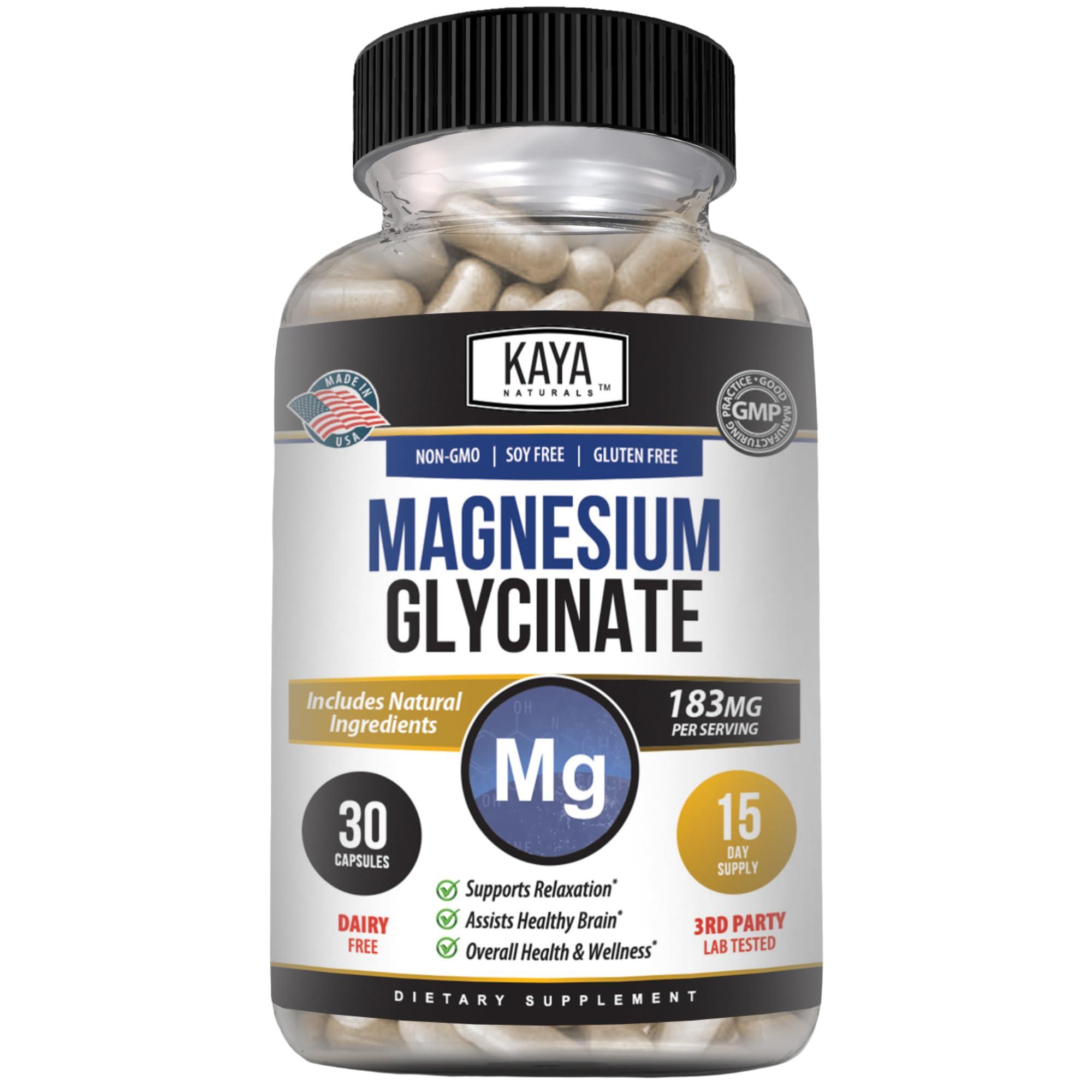 Kaya Naturals Magnesium Glycinate 183mg per Caps, Chelated for Maximum Absorption, Non-GMO, NO Gluten Dairy & Soy, Supports Muscle, Joint, and Heart Health (30 Count (Pack of 1))