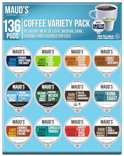 - [Flavorful Bulk Coffee Variety Pack]: Mauds "Variety Coffee Bulk Pack" offers a coffee lovers sampler of assorted coffee pods that offer a rich and robust taste. Enjoy a range of 12 flavors in one box: Tall Dark & Handsome, In the House Blend, Organic Mexico, Bubbies Breakfast Blend, Organic Guatemala, Sister Hazelnut, Dreamy Creamy Salted Caramel, Taller, Darker, & Handsomer, Organic Espress-o Yourself, French Roast from the Coast, Kona Coast, Dunk Your Donut Shop