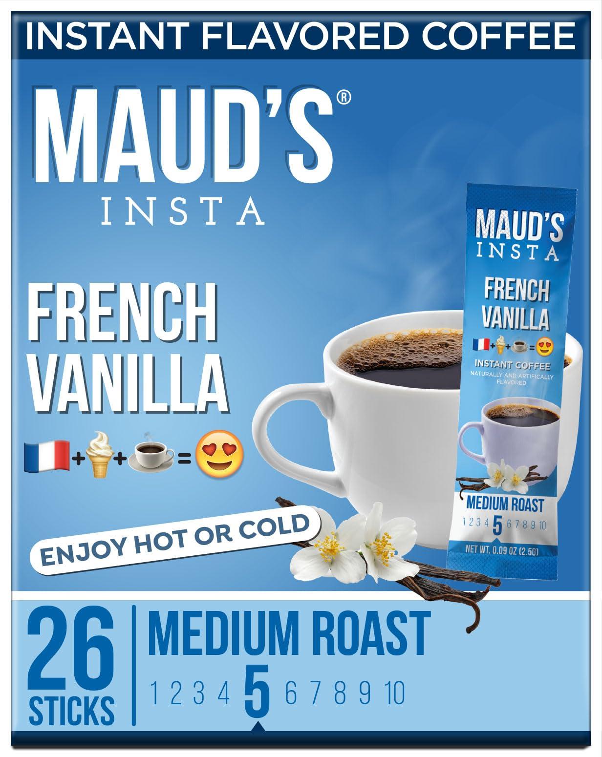 - [Flavorful French Vanilla Blend]: Maud's "French Vanilla" Coffee delivers a punch of zero sugar sweetness with a medium roast flavored coffee blend that packs hints of vanilla and creme. The result is a smooth-bodied coffee with a sweet aroma and a buttery finish of vanilla flavor.