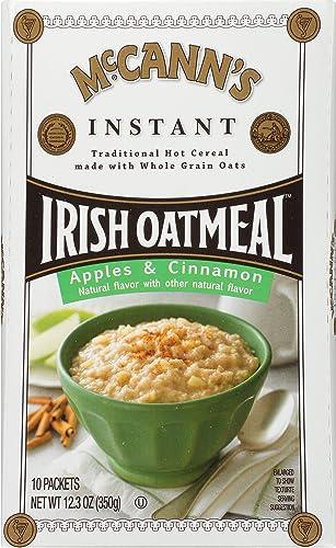 McCann's Apples & Cinnamon Irish Oatmeal is made with whole grain oats for a traditional hot cereal thats perfect for breakfast. This instant hot cereal is naturally flavored with apples and a hint of spicy cinnamon for a delicious apple cinnamon oatmeal that will help you start your day. Prepare this flavored oatmeal at home or toss a packet in your bag for a fast meal at work. McCanns Apples & Cinnamon oatmeal is certified kosher for those who have certain dietary restrictions, but still want great taste. Mix one of these oatmeal packets with milk or water and microwave on high for 1 to 2 minutes. McCanns oatmeal comes in a box of 10 instant oatmeal packets for easy storage and portion control servings.