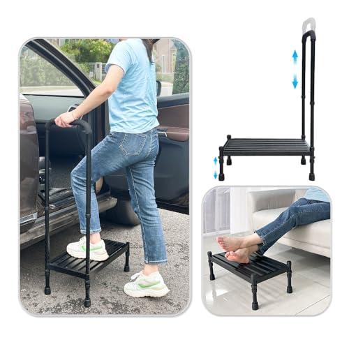 - Stable & Adjustable Overall height of the car step stool with handrail can be adjusted from 33.5 to 38.5 inches, with 5 height levels to meet the needs of different height groups. RV stepss rubber base has stronger grip and anti slip, further ensuring the user's safety when climbing up and down high steps.