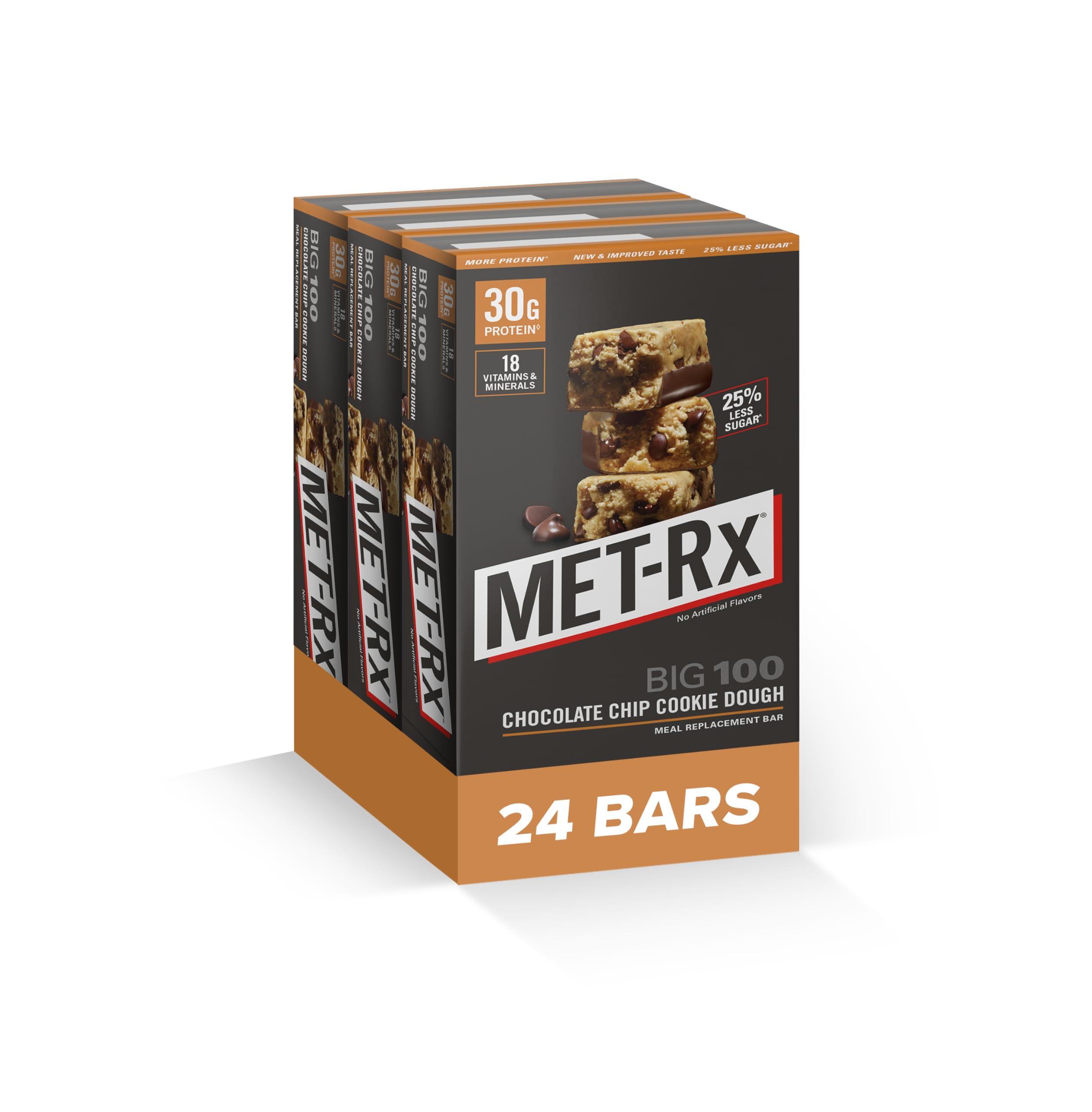 MET-Rx Big 100 Colossal Chocolate Chip Cookie Dough Protein Bars are power-packed meal replacement bars that provide high-quality protein to support your nutritional goals and satisfy your hunger. Rich milk chocolate chips and crunchy whey crisps combine to give this meal replacement bar a delicious, satisfying taste. Made with no artificial flavors, these MET-Rx bars provide 18 vitamins and minerals, including a significant source of Zinc and Vitamins A and C. Packed with 30 grams of protein per bar, these cookie dough protein bars are a great way to help promote muscle recovery. These protein bars are made with the MET-Rx Metamyosyn protein blend for both a quick and sustained delivery of amino acids to muscles. Toss these high protein bars in your gym bag for a tasty treat pre workout or post workout, or enjoy these MET-Rx protein bars anytime you need a quick meal on the run.