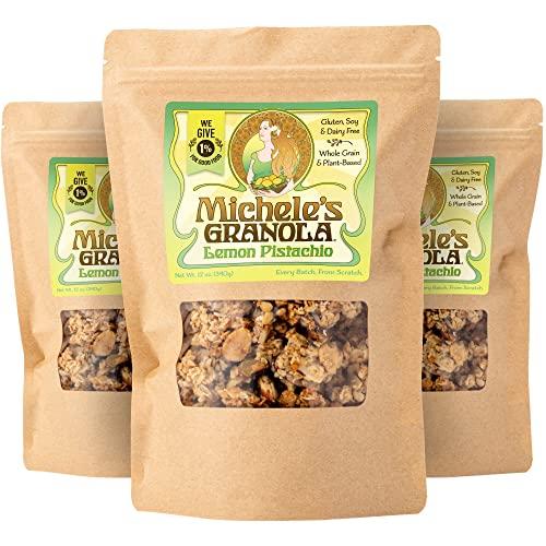 - ABOUT THIS GRANOLA: Formerly a farmers market exclusive, Michele's Granola Lemon Pistachio is a sunny mix of almonds, pistachios and sweet and tangy lemon juice. Try adding it to plain yogurt for an delicious breakfast, or substituting for graham crackers in your key lime pie crust.