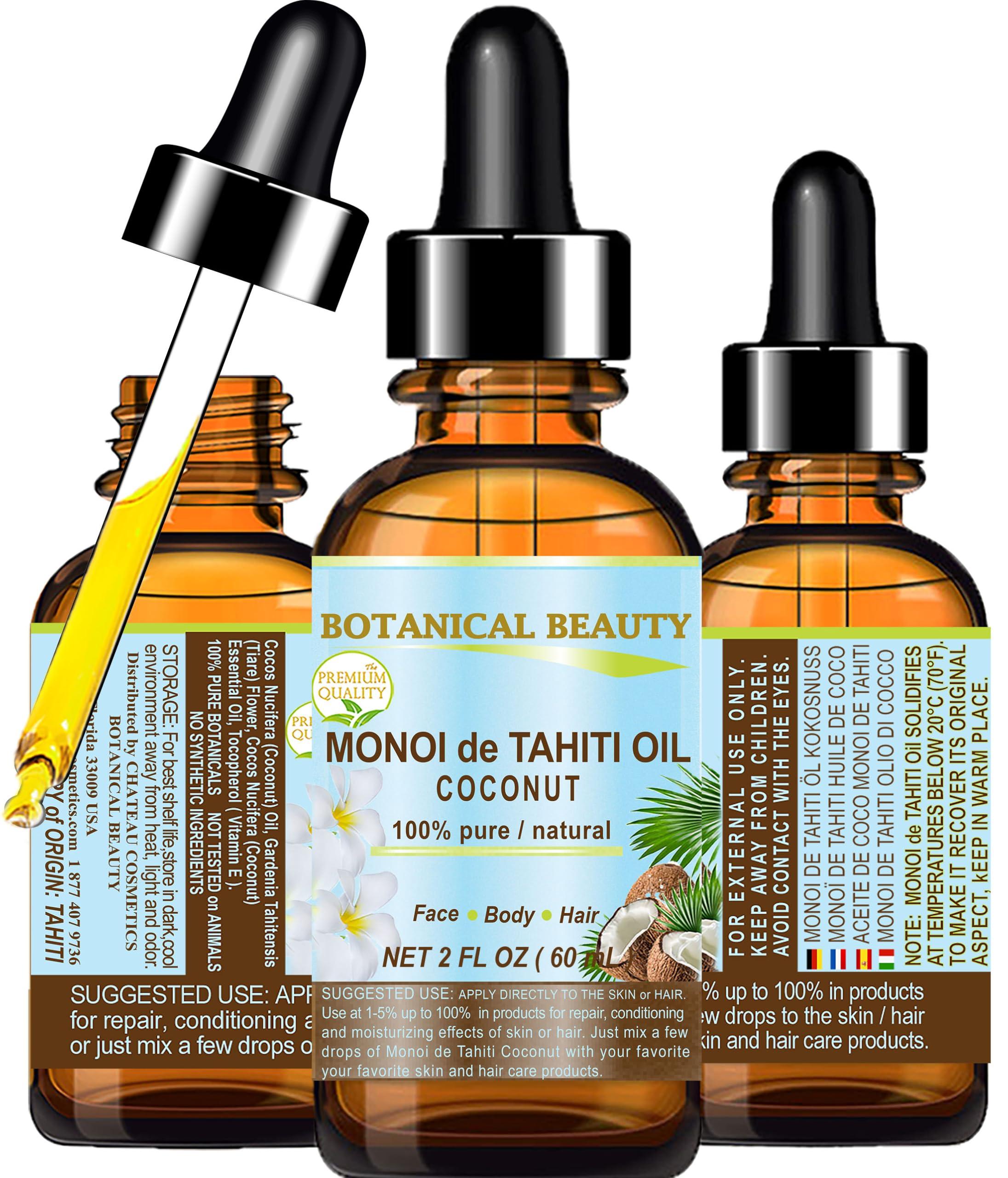 - Botanical Beauty MONOI DE TAHITI OIL COCONUT is considered to be one of the most extraordinary Oils for face, skin, body, hair, and nails with Tiare flowers infused in Organic Cocos Nucifera (Coconut) Oil with Tahitian COCONUT essential Oil. Botanical Beauty MONOI DE TAHITI OIL COCONUT is PURE UNREFINED VIRGIN Cold-pressed RAW with no additives. Light aroma of the Monoi and Coconut.