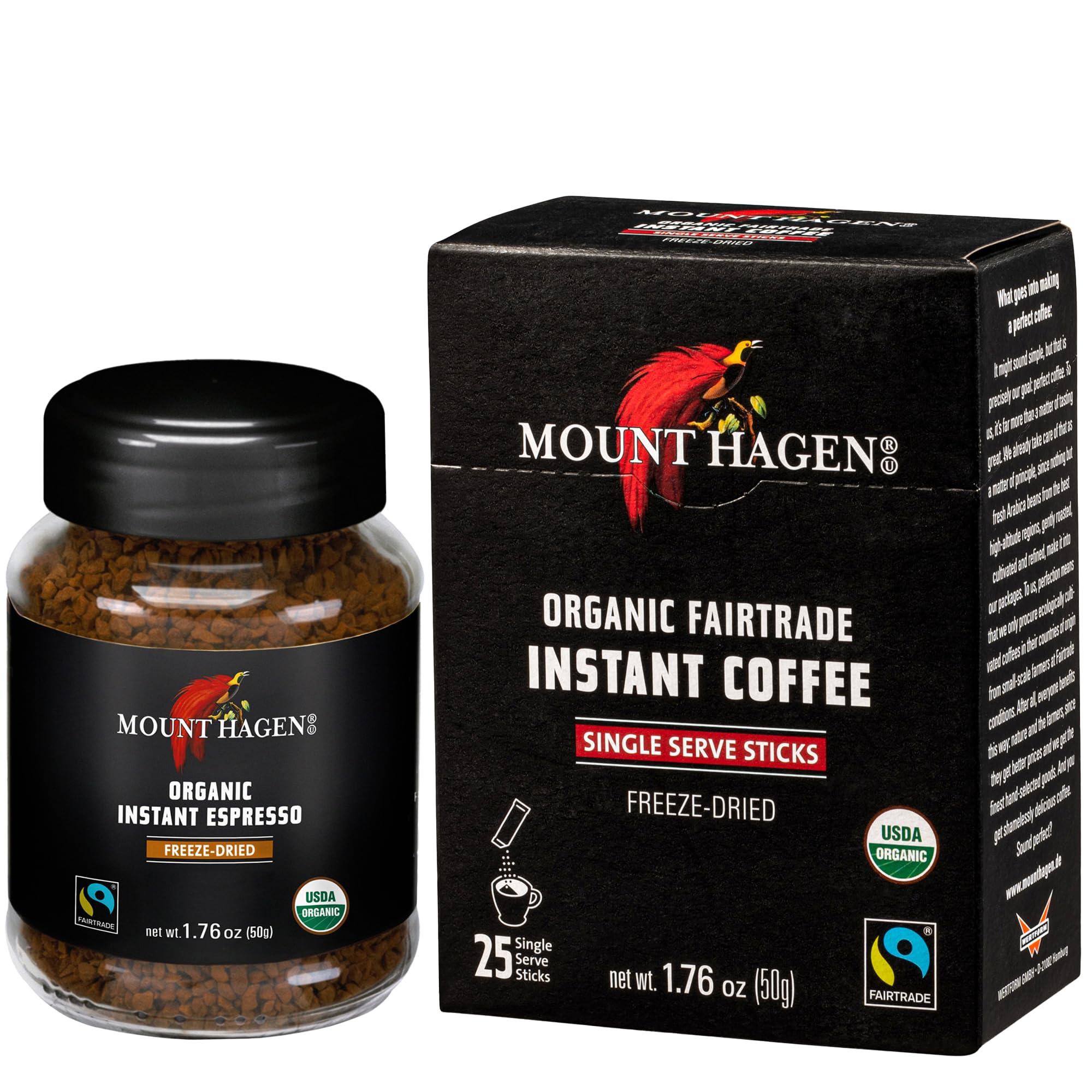 - AWARD-WINNING: Mount Hagen consistently tops lists of best instant organic coffees, becoming many a connoisseur's favorite joe-on-the-go. (Google it, and youll see!) Whether youre on the go, at the office, or on a mountaintop, dont settle for any less than the best. These single-serve sticks are packed with the same outstanding coffee as our award-winning jars- made from 100% USDA Organic, Fairtrade Arabica beans and also gluten-free and certified OU Kosher.