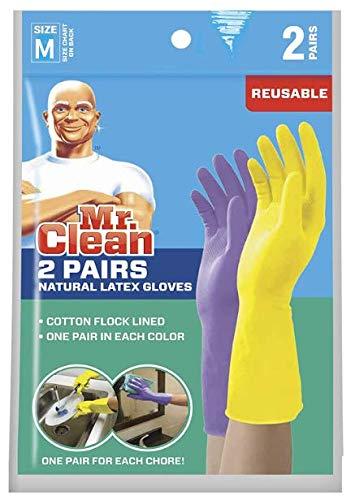 These Mr. Clean 2 pair reusable gloves are made from a quality natural rubber latex material. Two different colored pairs of gloves make it easy to use one pair in the kitchen and another in the bathroom. Extremely flexible and tear resistant, these cotton flock lined gloves offer ideal everyday protection for household chores.
