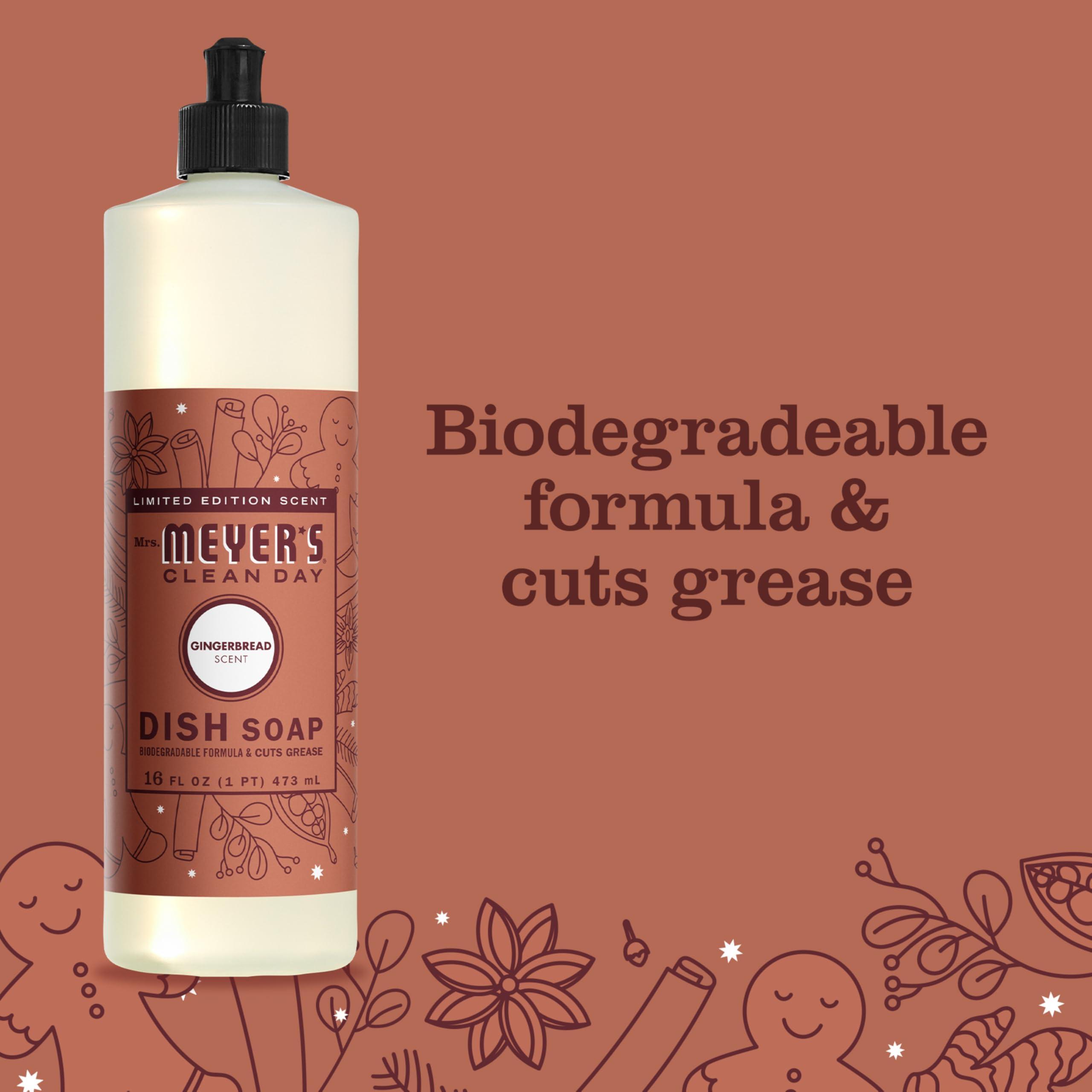 You probably already know that Mrs. Meyers Clean Day Dish Soap is specifically made to make grease disappear, while also providing a special scent for your entire home. But heres some news, and were pretty excited about it. Weve come up with a lovely new limited edition scent for our Mrs. Meyers Clean Day Dish Soap: Gingerbread. And its just in time for the special season. Fresh out of the oven Gingerbread. Warming nutmeg & spiced cinnamon bring back cozy kitchen memories. Plus, sweet brown sugar, the ICING on top! Our biodegradable formula dish liquid cuts through grease and is designed for hand washing dishes, pots, and pans. The liquid dish detergent contains plant-derived cleaning agents and other thoughtfully chosen ingredients that make dishes clean and bright. It's a Dish Soap made without parabens, phthalates, or animal-derived ingredients. And of course, this is a cruelty-free formula product. This limited edition Gingerbread seasonal scent is also available in other pleasant products youre sure to enjoy, such as Liquid Hand Soap, Multi-Surface Cleaner and Soy Candles. So go ahead, share the excitement. Make the most of this special time of year and bring the coziness of our Gingerbread scent into your home. Mrs. Meyers Rooted in Goodness.