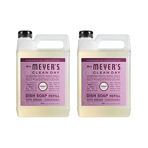 Mrs. Meyers Clean Day Liquid Dish Soap Refill, Peony, 48 Ounce (2 Pack) Mrs. Meyers Clean Day Dish Soap is specifically made to make grease disappear, while also providing a special, singular scent for your entire home. Our biodegradable liquid dish soap cuts through grease and is best for hand-washing dishes, pots and pans. The dishwashing liquid contains plant-derived cleaning ingredients that make dishes clean and bright. Made without parabens, phthalates, animal-derived ingredients and is always a cruelty-free dish soap.