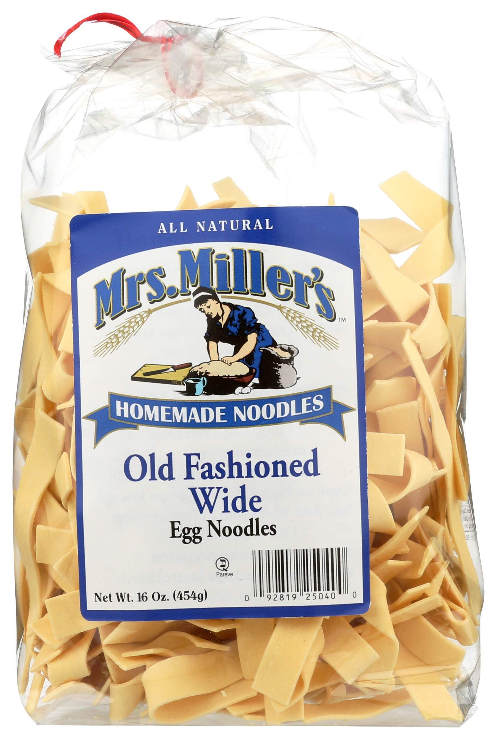 Old fashioned extra wide noodles contain durum wheat flour; enriched with vitamin B and iron; eggs and water ingredients. It is made with all nutritions facts and minerals. Wide noodles always provide a hearty, delicious meal. Millers bought an old car dealership which they turned into a noodle factory where they remain today. They also bought their first automated pasta machinery, which they have long since grown out of as well. Mrs. Millers continues to be family owned and operated.
