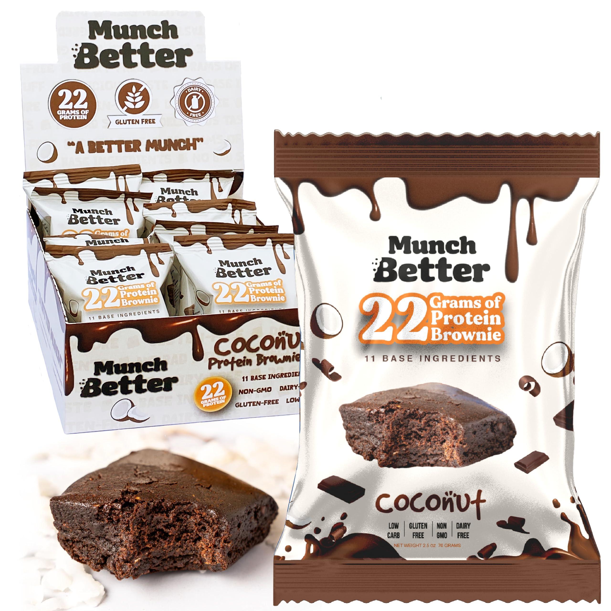 Munch Better 22g Protein Brownie, Gluten Free, Dairy Free,10g Collagen, Non GMO, High Protein Bar Chocolate Fudge Texture - 8 Count Box (Chocolate Coconut)