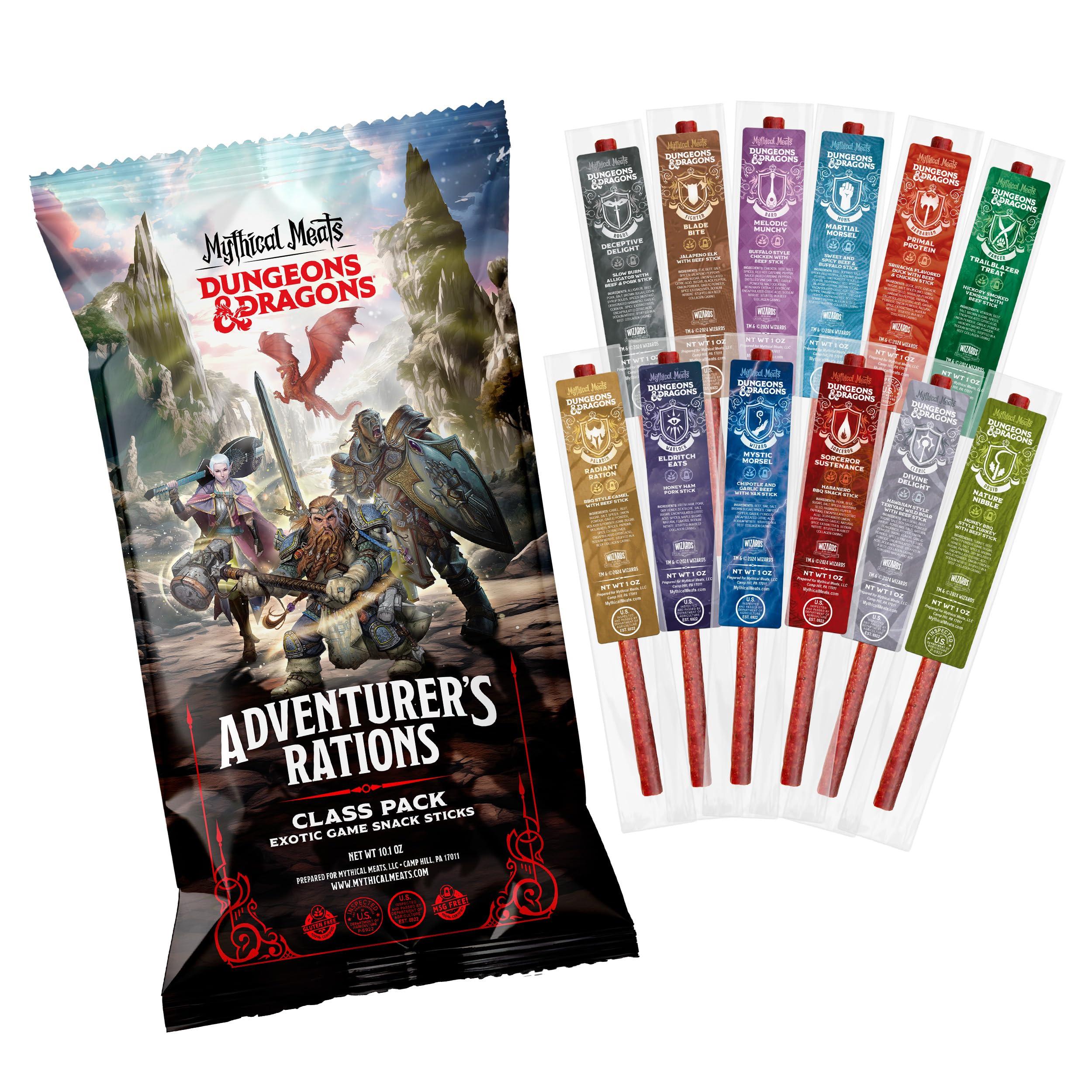 - ROLL FOR FLAVOR: Embark on a taste-filled quest with the officially licensed Mythical Meats Dungeons & Dragons 12-Pack Adventurer's Ration Class Pack. Featuring 12 unique flavors inspired by D&D classes, from the fiery Blade Bite (Fighter) to the enchanting Nature Nibble (Druid), this diverse assortment offers a bold and savory journey for your taste buds. Whether you're a seasoned adventurer or a curious newcomer, this pack has a flavor to satisfy every craving and fuel your epic campaigns.