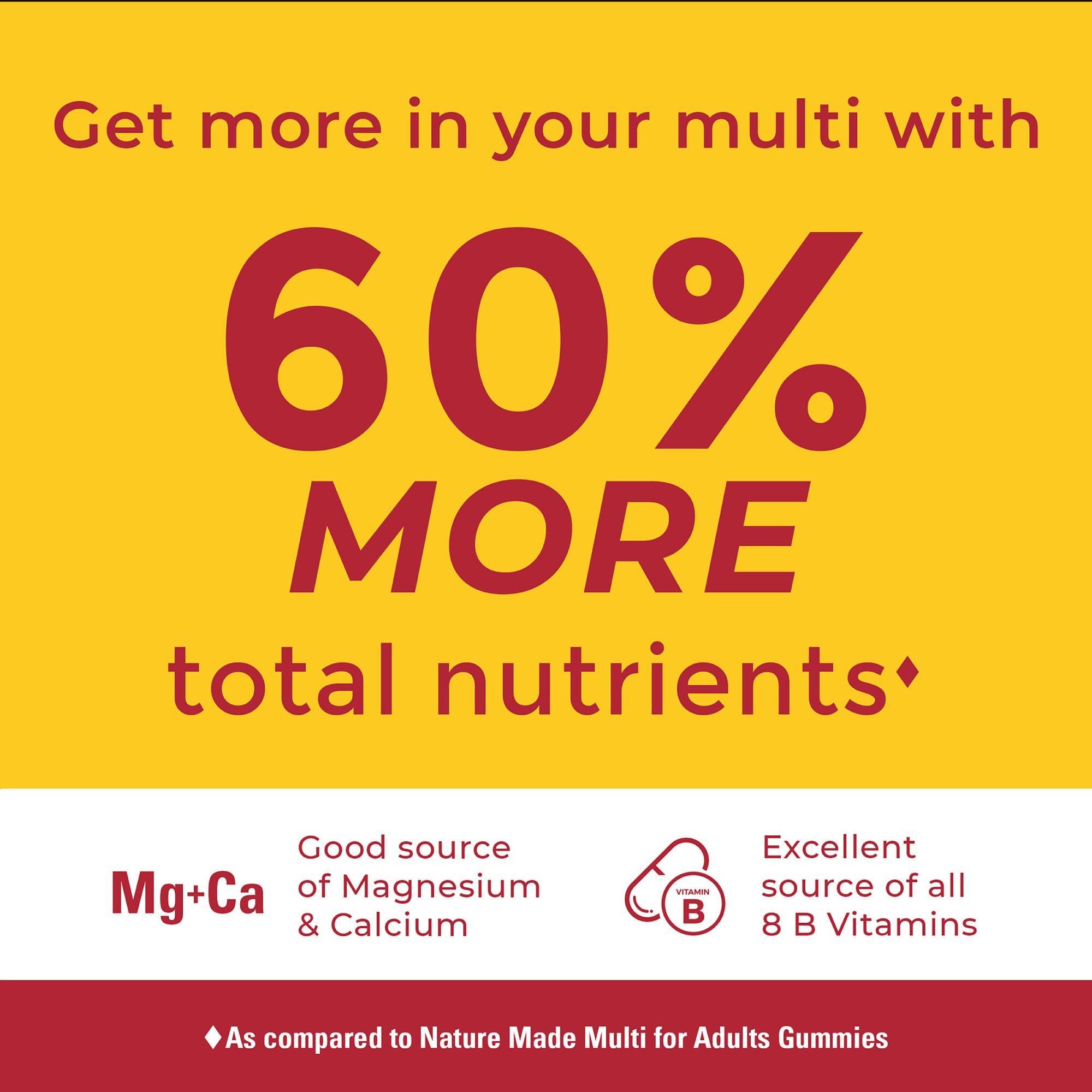 Nature Made Advanced Multi for Adults Gummies provide 20 key nutrients for daily nutritional support. Its both a multivitamin for women and a multivitamin for men, providing 60% more total nutrients(1) in tasty gummies plus a good source of Magnesium Citrate and Calcium and an excellent source of all 8 B Vitamins. This mens and womens multivitamin provides nutrients to support brain, heart and immune function, bone and muscle health, and energy metabolism (2). These daily vitamin gummies are gluten free with no artificial flavors, no high fructose corn syrup, and no synthetic dyes color derived from natural source. These vitamins for women & vitamins for men are in a tasty mixed berry with other natural flavors. Adults, chew 3 gummies daily. Start your day with womens vitamins and mens vitamins from Nature Made. (1) As compared to Nature Made Multi for Adults Gummies (2) Helps convert food into cellular energy. These statements have not been evaluated by the Food and Drug Administration. This product is not intended to diagnose, treat, cure, or prevent any disease.