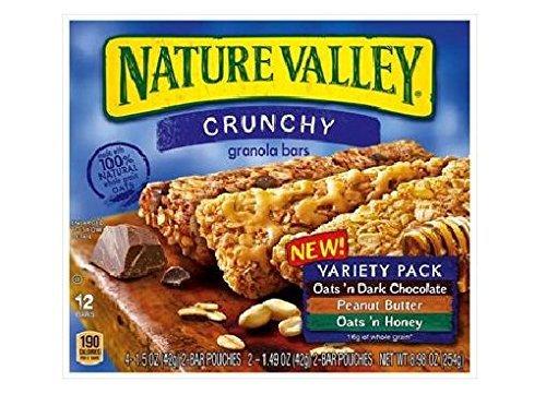 Product of USA. Pack of 6. Crunchy Granola Bars Made With 100% Natural Whole Grain Oats. Variety Pack Oats 'N Dark Chocolate Peanut Butter Oats 'N Honey 12 Bars. Contains Soy, May Contain Peanut, Almond And Pecan Ingredients. Oats 'N Dark Chocolate Ingredients: Whole Grain Oats, Sugar, Canola Oil, Dark Chocolat Pieces (Sugar, Chocolate Liquor, Cocoa Butter, Soy Lecithin, Natural Flavor Salt), Rice Flour, Honey, Cocoa Butter, Soy Lecithin, natural Flavor, Salt), Rice Flour, Honey, Cocoa Brown Sugar Syrup, Salt, Natural Flavor, Baking Soda, Soy Lecithin. Peanut Butter Ingredients: Whole Grain Oats, Sugar, Canola Oil, Peanut Butter (Peanut, Salt), Rice Flour, Brown Sugar Syrup, Salt, Baking Soda, Soy Lecithin. Oats 'N Honey Ingredients: Whole Grain Oats, Sugar, Canola Oil, Rice Flour, Honey, Salt, Brown Sugar Syrup, Baking Soda, Soy Lecithin, Natural Flavor.
