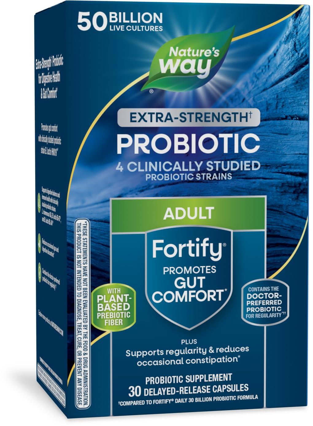 - Nature's Way Extra Strength** Probiotic Adult, 50 Billion CFU is formulated for adults with 11 probiotic strains. Support digestive and immune health.* Plus plant-based prebiotic fiber, food for good bacteria.*