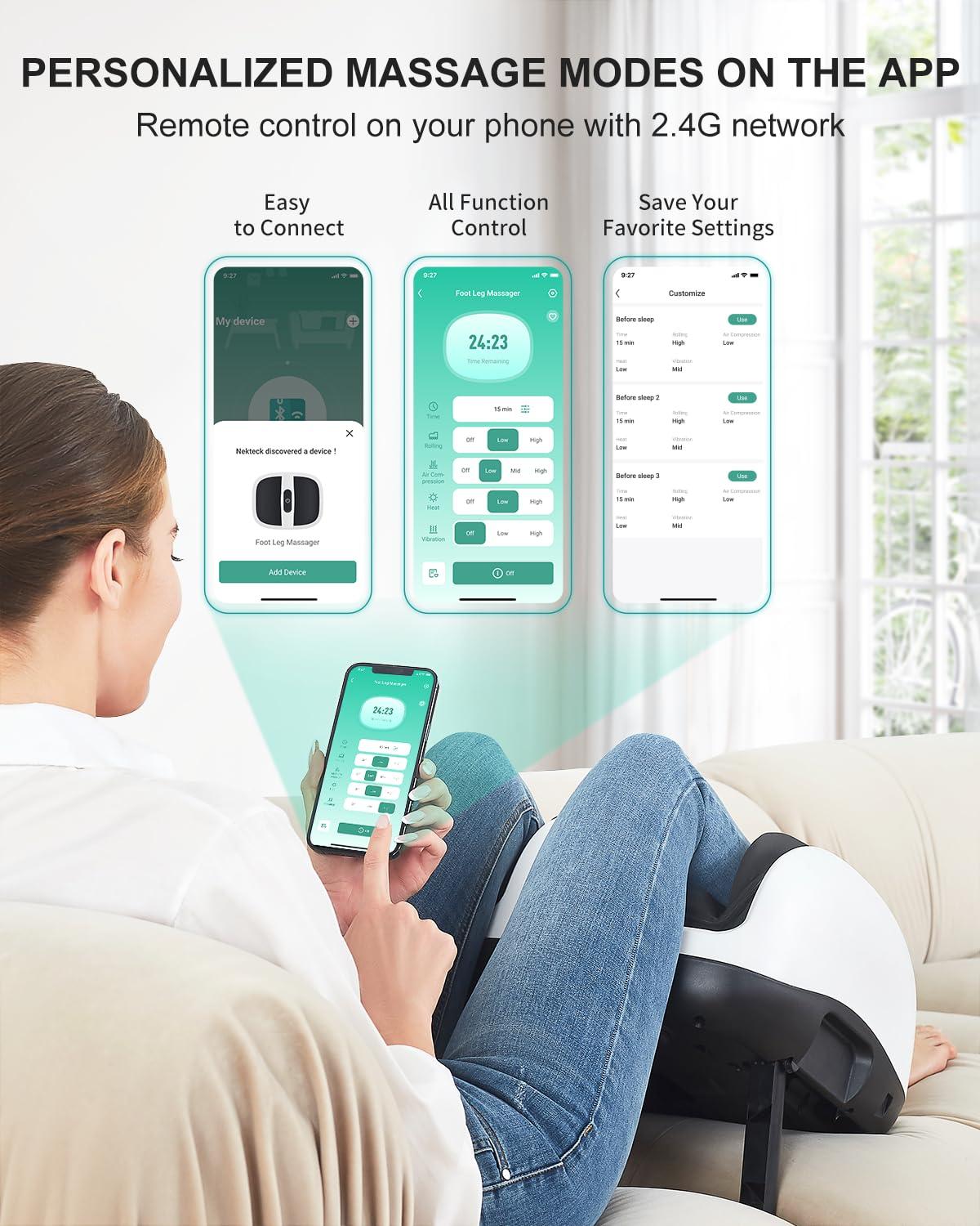 - APP And Panel Control: Upgraded shiatsu foot massager can be controlled through the panel and also connected to Nekteck APP for easy adjustment of kneading, rolling, vibration, heating, and timer settings. You can DIY and save your favorite settings to be ready for the next use at any time, putting your ideal calf massage within reach of your fingertips. Note: Remote control not included.