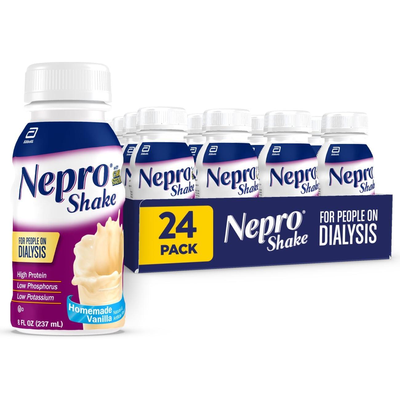 Nepro nutrition shakes are specially designed to help meet the nutrition needs of people on dialysis. One serving has 19 grams of protein and 420 nutritious calories to help replenish nutrients lost due to dialysis. It's low in potassium and phosphorus for patients with kidney disease. It tastes great cold and comes in three delicious flavorsHomemade Vanilla, Butter Pecan, and Mixed Berry.