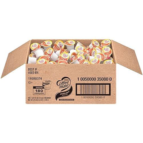 Nestle Coffee mate Hazelnut flavored liquid creamer singles are a crowd pleaser. Within each cup is a harmonious blend between a deliciously rich, velvety smooth classic and sweet nutty hazelnut notes that will enhance and enrich your coffee offer with a touch of differentiation. Packaged in a 180 count box, these are the perfect solution for a delicious and convenient option to customize your favorite beverage. These creamer singles dont need to be refrigerated, and can retain their irresistible flavor at room temperature for up to 9 months. Easy to use - shake, open and pour. Non-Dairy + Lactose-Free + Cholesterol-Free + Gluten-Free + Kosher Dairy. Coffee mate is America's #1 coffee creamer. With a variety of flavors and formats, Coffee mate has your coffee creamer needs covered. Delight your employees, customers and guests by offering Coffee mate liquid creamer in your workplace, break room or kitchen. Covered by the Nestl Professional 60-Day Satisfaction Guarantee for Select Products. See below for details.
