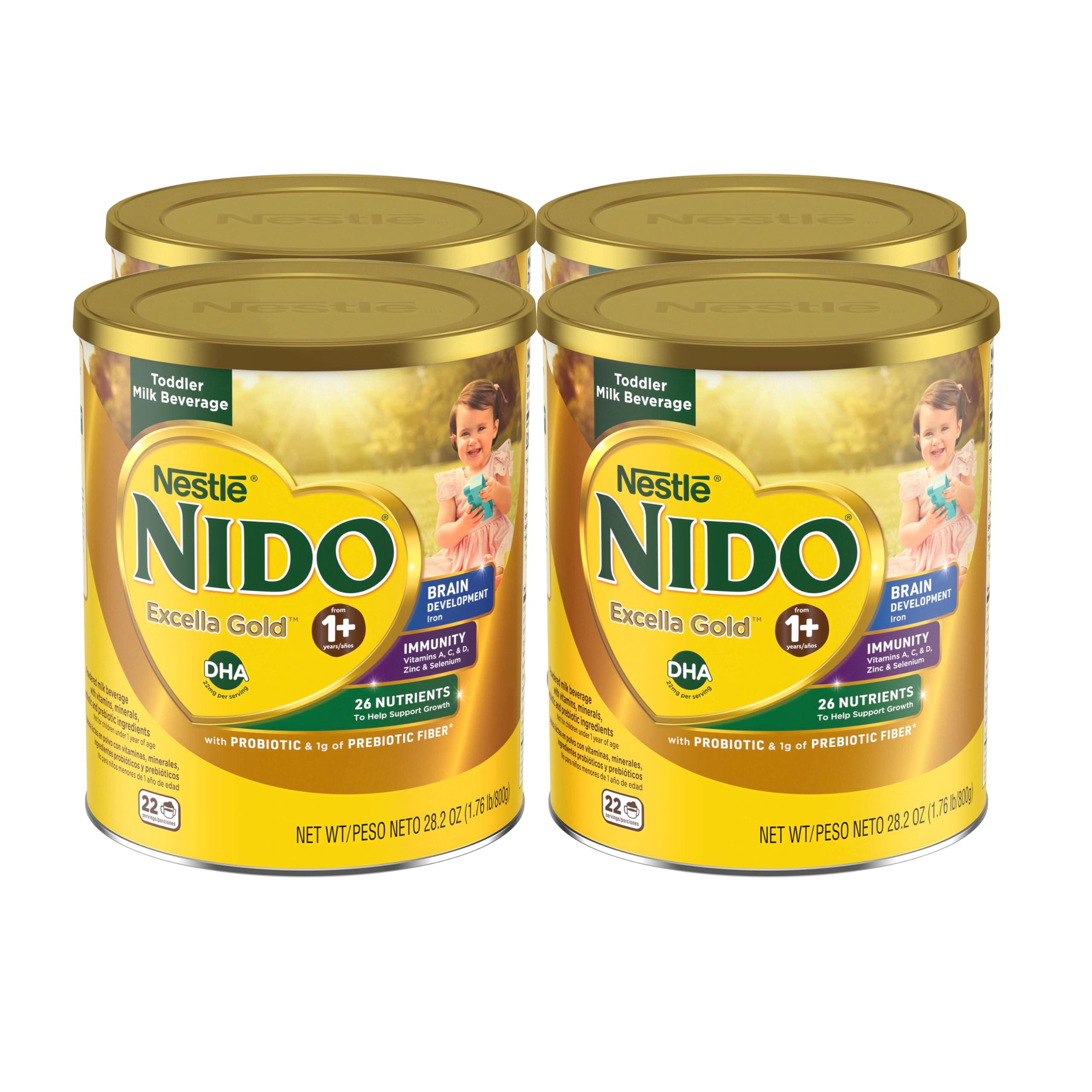 NIDO Excella Gold Excella Gold can help support your little one's growth and development, hand in hand with a healthy diet, NIDO Excella Gold has 26 nutrients to help support growth, including Iron to support brain development and Vitamins A, C D, Zinc and Selenium to support immunity, 22mg of DHA per serving, with probiotic and 1g of prebiotic fiber. Add 4 scoops/tablespoons of NESTL NIDO Excella Gold to a glass (8 fl. oz.) of warm water mix well. NOTE To avoid clumping, ensure utensil is dry before inserting into powder. Always add powder to water and not the reverse.