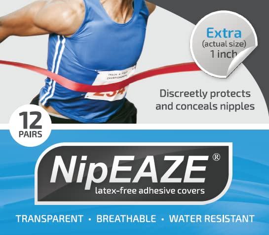 Ladies, you are going to love what NipEAZE can do for you and your wardrobe. How many times have you wanted to wear a lightweight top or dress without a bra? Or, just throw on a thin t-shirt with no worries? Some guys have the same problem. So certain shirts cant be worn without wearing a couple of layers underneath, and that can be a very uncomfortable hassle. The Solution... With its breathable and suppressing design, NipEAZE gives you the freedom to wear whatever, whenever! NipEAZE is so comfortable that it can be worn all day. It is the perfect accessory for women or men who seek a modest look in lightweight or clingy clothing. NipEAZE is the clear choice for runners and other athletes who experience nipple chafing. With its durable adhesive and sweat resistant design, NipEAZE is like a shield that protects you from the constant friction between you and your clothing. Because it is thin and breathable, it gives you the freedom to wear whatever you want while you run - no more special shirts or messy roll-ons! NipEAZE is easy to apply, discreet, and comfortable enough to be worn all day. Surfers and Bodyboarders use NipEAZE because it is water-resistant and transparent, so wearing a pair is hardly noticeable yet it protects the nips from the constant friction between you and your board or vest. Now available in 3 sizes: Regular (for youth/teens) 15pairs; Extra 1 (best for general use) 12pairs; Full 1.25" Sports Fashion (different listing) 12pairs.