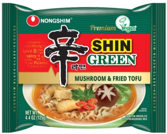 - Get ready to enjoy a savory and satisfying meal with Nongshim Shin Green Mushroom & Fried Tofu Ramyun noodles. Made with enriched wheat flour, potato starch, and palm oil, this vegetarian and vegan-friendly instant noodle option is sure to impress. The seasoning mix includes black pepper, dried cilantro, garlic, and natural flavors for an added kick of flavor. With only 280 calories per serving size of 63g, these noodles are a great option for anyone looking for a quick meal without sacrificing