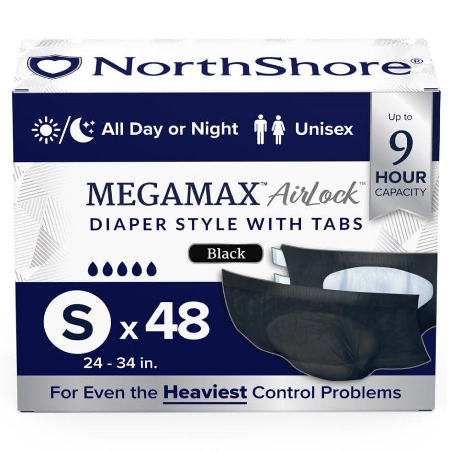 Get up to 9 hours of cool, breathable protection with NorthShore MEGAMAX AirLock Briefs. A soft, breathable cloth-like exterior helps promote skin health while remaining durable to prevent sagging. Refastenable adhesive tabs stay securely in place on the same plastic frontal landing zone as our world-class MEGAMAX Tab-Style Briefs. The extra-large, extra-wide absorbent core provides excellent coverage in the front and rear even for active users and restless sleepers. Tall stand-up leak guards, leg cuffs, and waistband elastics protect against leaks from the leg openings and around the waist. NorthShore's custom sizing allows for a better fit and leak protection for those with more unique body shapes.