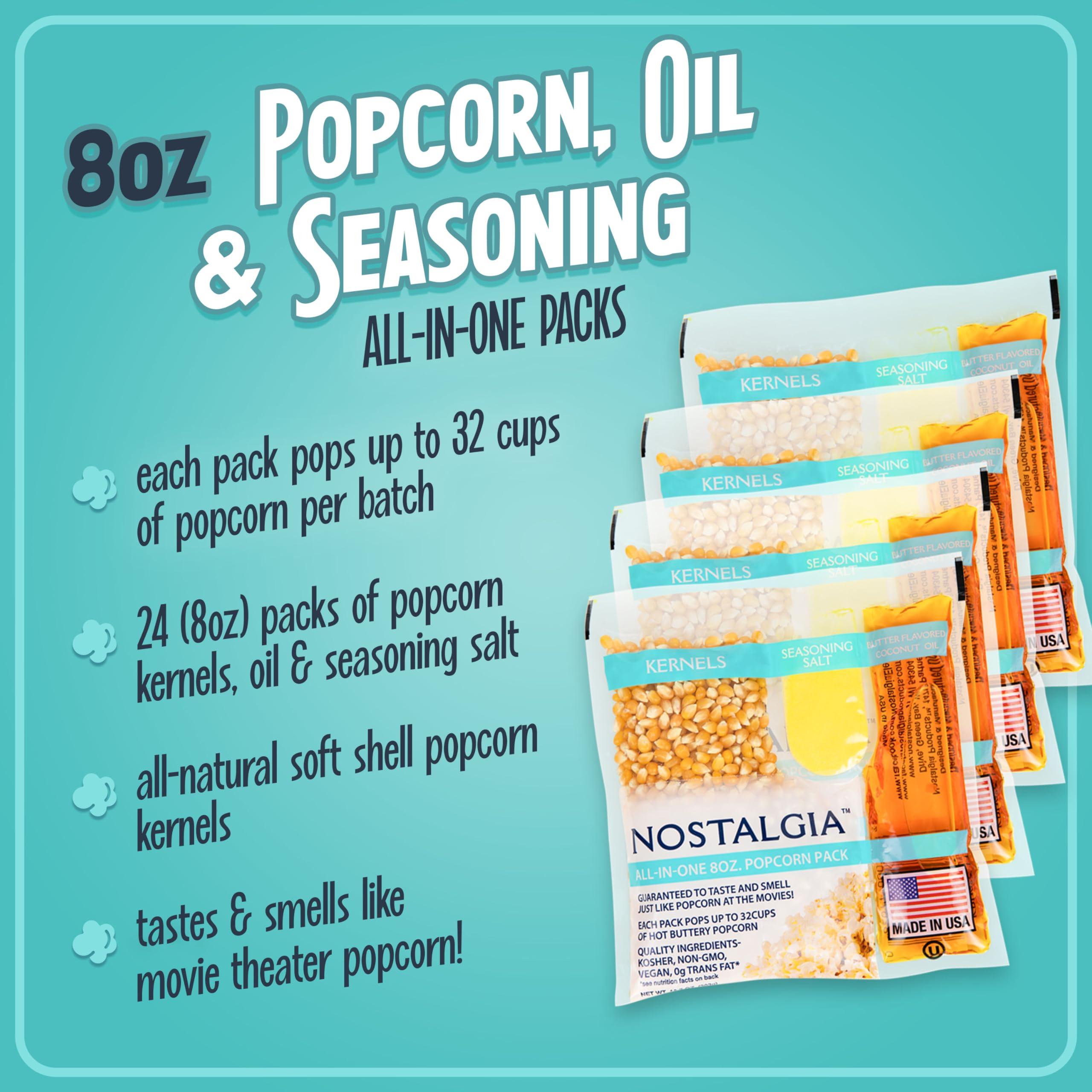 - PAIR WITH NOSTALGIA POPCORN MAKERS: Use this all-in-one pack with any Nostalgia kettle-style or stirring popcorn maker that is 8 oz. or larger.