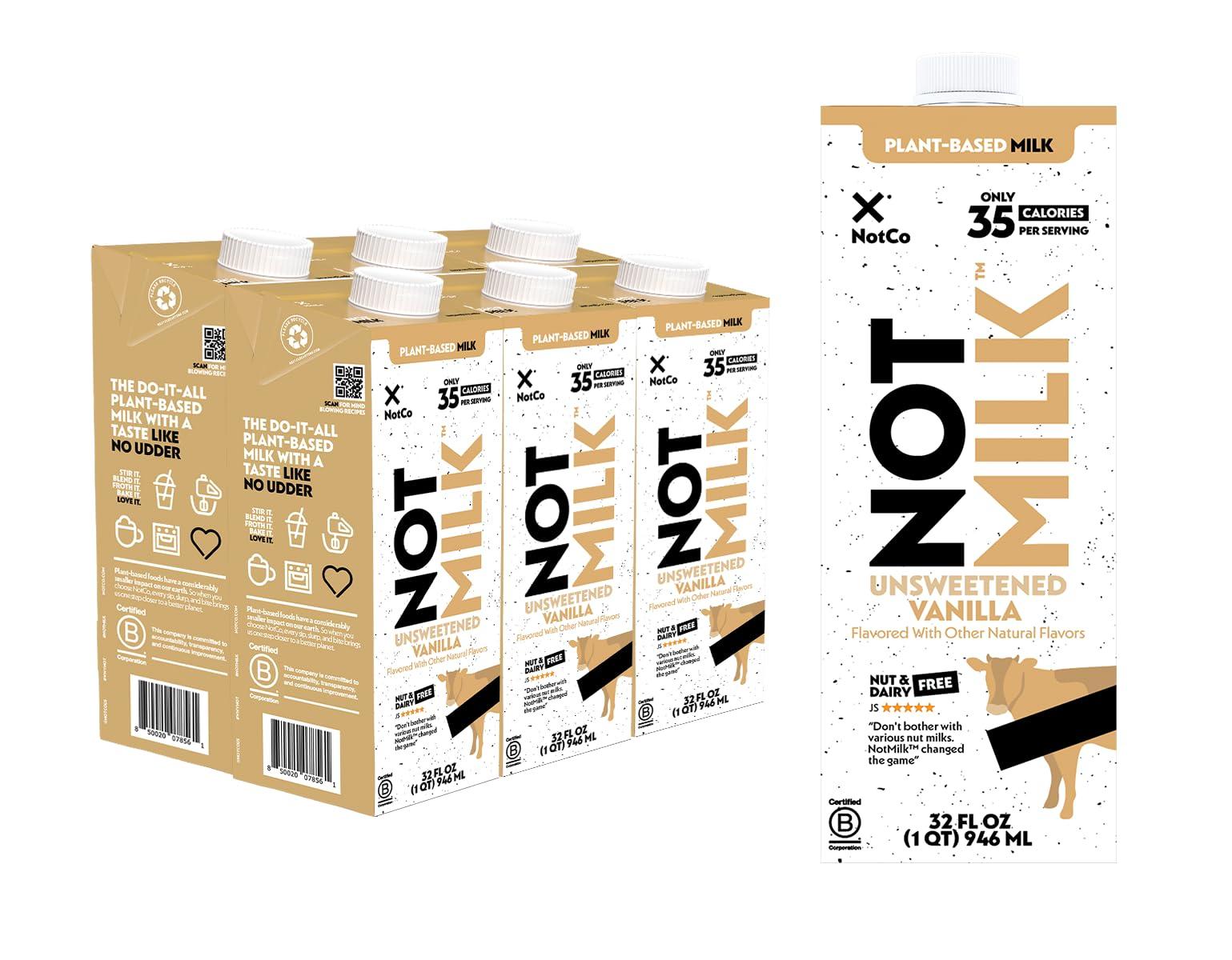 - NotMilk Unsweetened Vanilla A sugar free plant-based milk available in shelf-stable 6-Pack of 32 oz. cartons (no refrigeration required).