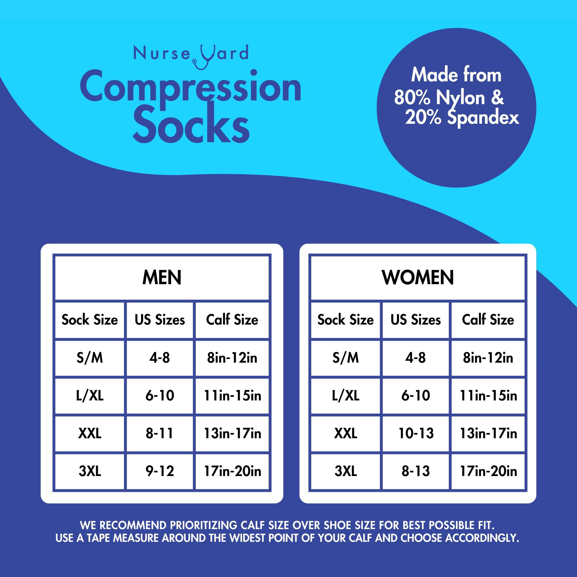 Nurse Yard compression socks are the ultimate solution for anyone spending long hours on their feet, especially nurses and medical professionals. Designed with 20-30 mmHg of graduated compression, these compression socks for women and men help improve blood flow, reduce swelling, and alleviate pain. From small to plus size compression socks, Nurse Yard has you covered. Standing or sitting for prolonged periods causes fluid to pool in your legs, causing leg pain, foot swelling, and neuropathic symptoms. Our compression socks' styles feature a unique design that starts with 30 mmHg of pressure at the ankle, gradually decreasing to 20 mmHg at the calf. This design supports blood flow back to the heart, reducing swelling and preventing conditions like Deep Vein Thrombosis (DVT). Nurse Yard socks are perfect for those seeking relief from venous disorders and other circulation issues. Nurse Yard compression socks are crafted to not slip, ensuring they stay in place during even the most active days. The wave stitching provides a breathable, comfortable fit, while the arch support helps relieve plantar fasciitis and arch pain. The zero-toe compression feature ensures your toes remain pressure-free, making these support socks for women and men the optimum choice for all-day wear. Our compression socks arent just for healthcare professionalstheyre versatile enough to be used as running socks by both men and women. Ideal for exercise, travel, pregnancy, or post-surgery recovery, compression socks help with lymphatic drainage, improve oxygenation, and prevent blood clots. Nurse Yard socks, designed in the USA, offer unmatched comfort and support, backed by a contentment promise. Whether youre buying for yourself or as a thoughtful gift idea for a healthcare hero, our compression socks help you stay pain-free and energized throughout the day. Experience the difference with Nurse Yard compression sockssupporting the hands that heal, one step at a time.