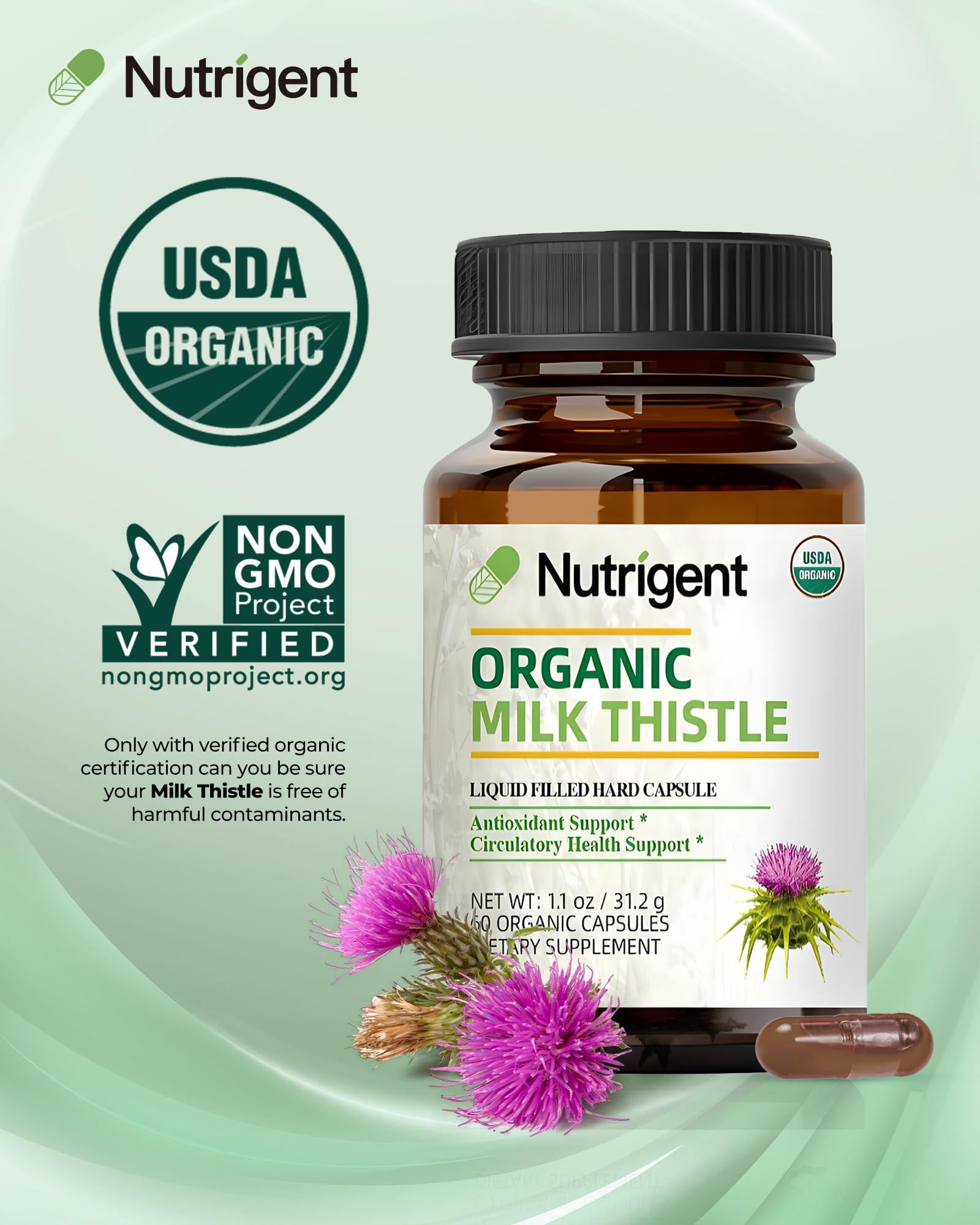 - USDA Organic Certified: Non-organic milk thistle may be highly contaminated and potentially harmful to your liver. With Nutrigents USDA Organic Certified milk thistle, youre guaranteed a plant-based, vegan, non-GMO supplement. Each serving contains 350mg of 25:1 concentrated milk thistle extract, equivalent to 8750mg of the whole herb, standardized to 80% active ingredients, providing 280mg of silymarin.