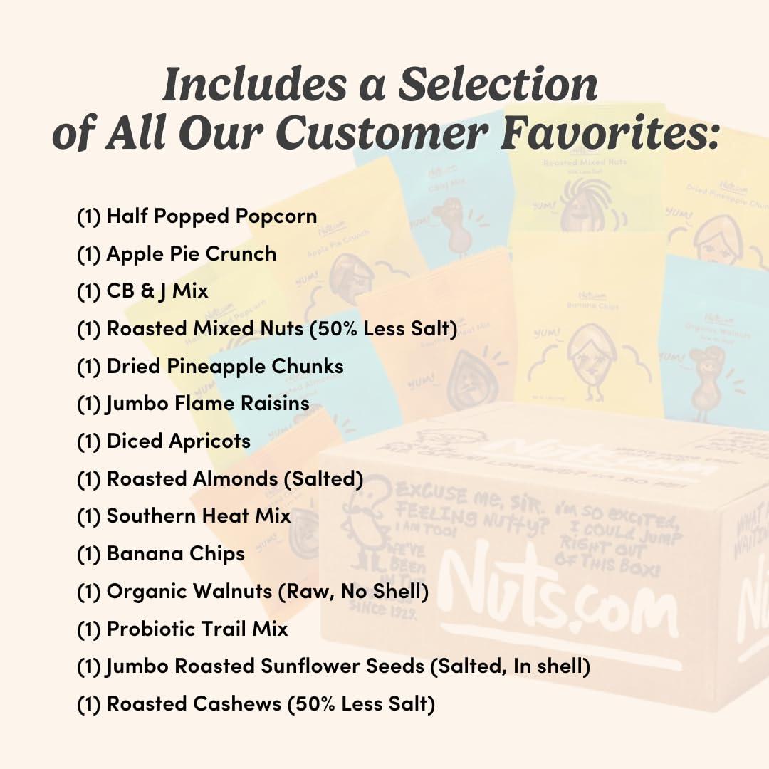 - Assorted Snacks with Single Serve Convenience: Enjoy perfectly portioned servings of almonds, cashews, walnuts, and sunflower seeds alongside dried apricots, pineapple chunks, jumbo flame raisins, banana chips, and apple pie crunch. This food gift box offers variety and freshness with every bite.